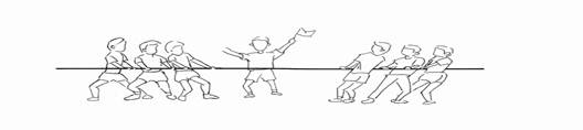 比赛时,两队参与选手用力向后拉,若一方先有一半或一半以上选手被对方拉过中线,则判对方胜出。(见图1-4-3)