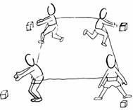 此种比赛方法参与人数为4人,成正方形四角站位。