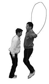 跳绳,是一项流传广泛的民俗体育活动。只需一条绳索、一块空地,在门庭、院中或街心花园等地都能进行。可单人跳,双人跳,也可集体跳大绳,绳子呈椭圆体来回摇动,随着高度和节奏的提高,能够都顺利跳过的为取胜者(见图3-21-1)。