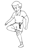 游戏者将毽抛起,左腿平稳支撑,右腿屈膝抬起,用大腿或者膝部向上磕毽,然后脚落地,重复击毽(见图3-18-5)。