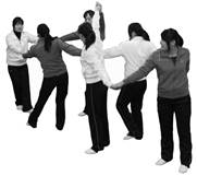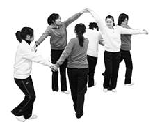 拜罗圈,起源于民间并且深受女孩子们的喜爱。在我省鲁北、鲁西一带广为流传。一般三人以上,手拉手围成一个圈,边唱歌谣边进行游戏。歌谣:“拜、拜、拜罗圈,高家的闺女才十三;红棉袄,绿镶边,遇着马圈往里钻”。当唱到歌谣中的“钻”字时,手不松开,领头的一人低头带动众人从与自己相邻近的一位游戏者的腋下空档处钻过,大家就这样唱着歌谣反复钻来钻去(见图4-18-1)。