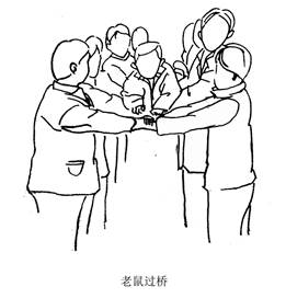 “老鼠”过桥,是一项深受人们喜爱的民俗体育活动,现在主要流传于我省鲁西南一带。相传是由人们庆祝胜利时将某人抛起的动作演变而来。“老鼠”过桥是一项集体配合、力量类的活动,参与者面对面站立并且手相互紧握搭成一个“桥”,选出一个体重较轻动作迅速者作为 “老鼠”,“老鼠”通过身体的扭动配合搭桥者之间接力性的抛送尽快通过“桥”。多组进行比赛时哪一组的“老鼠”最快过完桥,即为获胜方(见图4-4-1)。