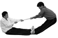 比赛开始前,参赛双方面对面席地而坐,两腿伸直,脚掌相对。两人须同时握紧木棍两端(见图1-6-2)。