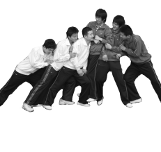 开始时,两边的选手不直接进行身体接触的对抗,而是通过夹在中间的第三者来传递力量。这样“挨挤的”人,就像个不倒翁一样,随着两边人来回晃动(见图1-8-3)。