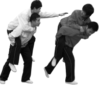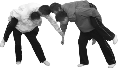 比赛开始前,一人作“战马”,另一人做“骑士”(俗称“背上的”见图1-3-1、“骑马的”,见图1-3-2)。